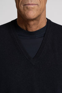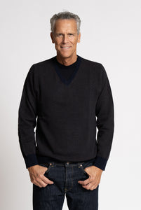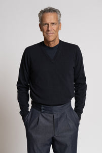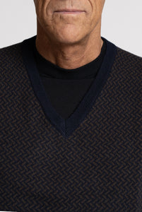 Maglia Scollo a V in Lana Merino Micrografica Geometrica, Navy e Marrone
